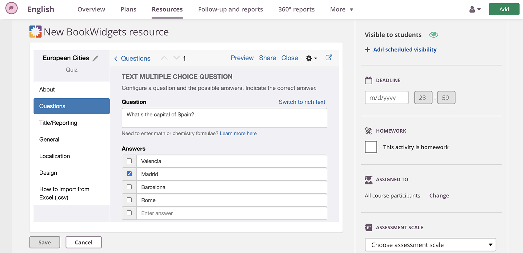 With BookWidgets' itslearning integration, you can add more than 40 interactive exercises such as active plots, automatically graded tests, worksheets and flashcards, and customize them with your own lesson content, right from within your familiar itslearning environment.